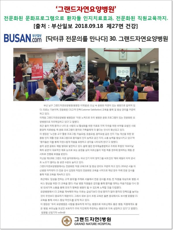 [부산일보] 전문화된 문화프로그램으로 환자들 인지치료효과, 전문화된 직원교육까지. 페이지 정보 작성자 최고관리자 작성일18-09-26 16:50 조회1,986회 댓글0건 이전글 다음글 목록 본문 [ 출처 : 부산일보 2018. 9.18 제27면 임원철 선임기자 ] 댓글목록 등록된 댓글이 없습니다. 이전글 다음글 목록