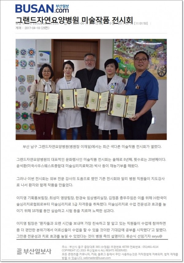 [부산일보] 그랜드자연요양병원 미술작품 전시회 페이지 정보 작성자 최고관리자 작성일17-04-26 10:38 조회1,802회 댓글0건 이전글 다음글 목록 본문 [출처 : 부산일보 2017.4.18 제29면 류순식 선임기자] 댓글목록 등록된 댓글이 없습니다. 이전글 다음글 목록