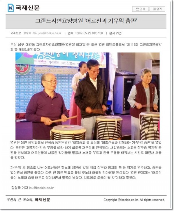 [국제신문] 그랜드자연요양병원 '어르신과 가무악 춤판' 페이지 정보 작성자 최고관리자 작성일17-06-02 15:54 조회1,533회 댓글0건 이전글 다음글 목록 본문 [출처 : 국제신문 2017.5.30 제29면 정철욱기자] 댓글목록 등록된 댓글이 없습니다. 이전글 다음글 목록