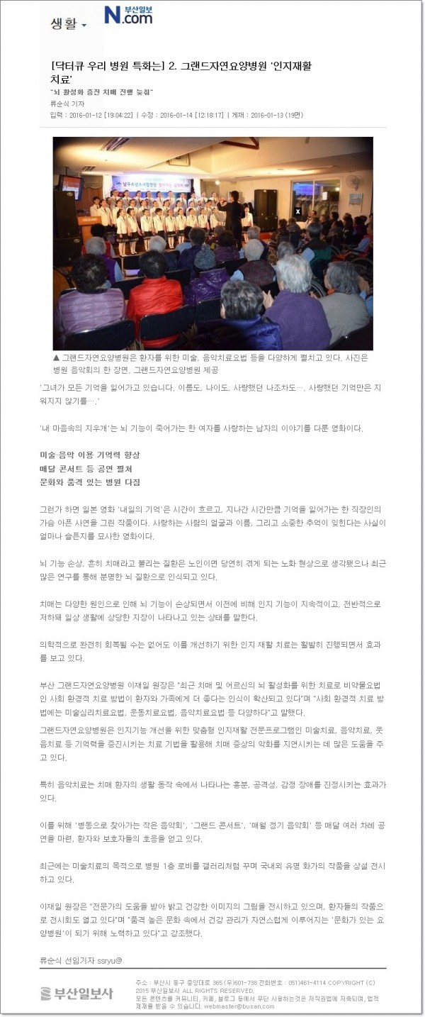 [부산일보] 닥터큐 우리 병원 특화는 "그랜드자연요양병원-인지재활치료" 페이지 정보 작성자 최고관리자 작성일16-01-25 16:10 조회2,104회 댓글0건 이전글 다음글 목록 본문 [ 출처 : 부산일보 2016.1.13 제19면 ] 댓글목록 등록된 댓글이 없습니다. 이전글 다음글 목록
