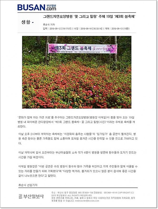 [부산일보] 그랜드자연요양병원 '꽃 그리고 힐링'주제 19일 "제3회 봄축제" 페이지 정보 작성자 최고관리자 작성일16-04-26 09:53 조회1,712회 댓글0건 이전글 다음글 목록 본문 [출처 : 부산일보 2016.4.13 제19면 류순식 선임기자] 댓글목록 등록된 댓글이 없습니다. 이전글 다음글 목록