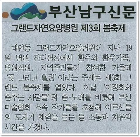 [남구신문] 그랜드자연요양병원 제3회 봄축제 페이지 정보 작성자 최고관리자 작성일16-05-13 14:21 조회1,607회 댓글0건 이전글 다음글 목록 본문 [출처 : 남구신문 2016.4.25 제6면] 댓글목록 등록된 댓글이 없습니다. 이전글 다음글 목록