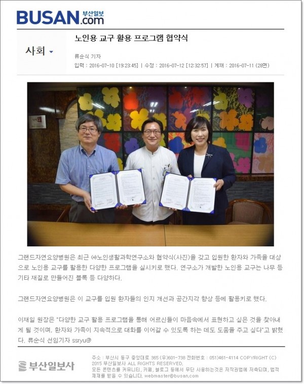[부산일보] 노인용 교구 활용 프로그램 협약식 페이지 정보 작성자 최고관리자 작성일16-07-19 18:55 조회1,648회 댓글0건 이전글 다음글 목록 본문 [출처 : 부산일보 2016.7.11 제28면 류순식 기자] 댓글목록 등록된 댓글이 없습니다. 이전글 다음글 목록