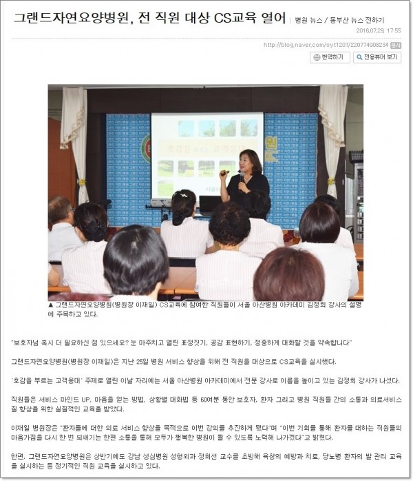 [오륙도 신문] 그랜드자연요양병원 전직원대상 CS교육 - 서울 아산병원 아카데미 전문 강사 페이지 정보 작성자 최고관리자 작성일16-08-09 12:03 조회1,730회 댓글0건 이전글 다음글 목록 본문 [출처 : 오륙도 신문 2016.7.29 서영태 기자] 댓글목록 등록된 댓글이 없습니다. 이전글 다음글 목록