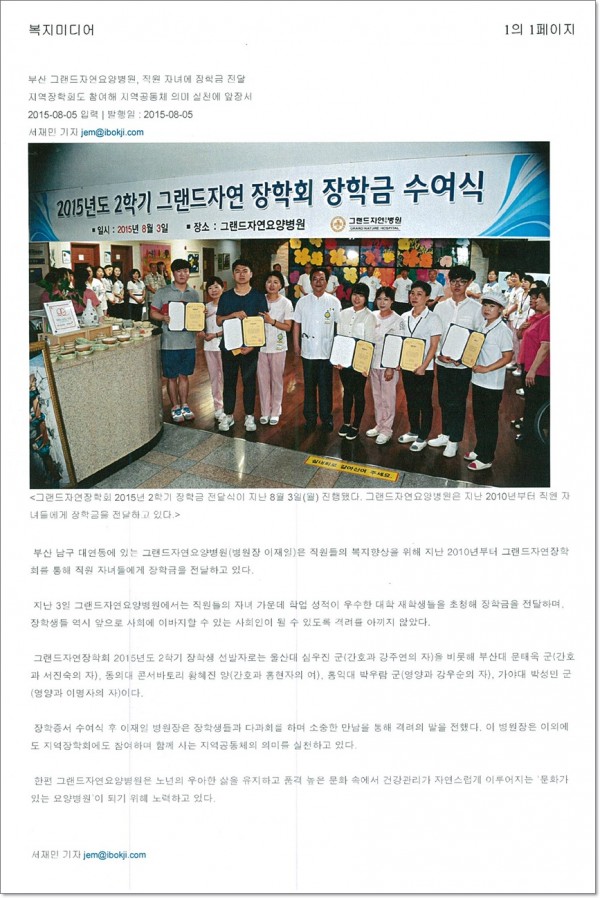 [복지미디어] 직원 자녀에 장학금 전달, 지역 장학회도 참여해. 페이지 정보 작성자 최고관리자 작성일15-08-19 11:26 조회1,898회 댓글0건 이전글 다음글 목록 본문 [출처 : 복지미디어 2015.8.5 서재민 기자] 댓글목록 등록된 댓글이 없습니다. 이전글 다음글 목록