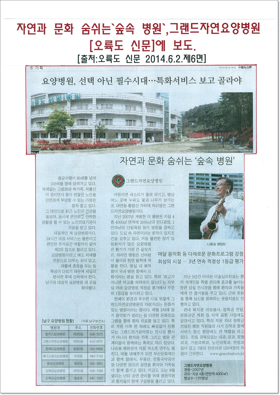 [부산 오륙도 신문]자연과 문화 숨쉬는 '숲속 병원' ,그랜드자연요양병원 보도. 페이지 정보 작성자 그랜드자연병원 작성일14-06-09 12:25 조회2,307회 댓글0건 이전글 다음글 목록 본문 [출처 : 부산 오륙도 신문 2014년 6월 2일 제6면] 댓글목록 등록된 댓글이 없습니다. 이전글 다음글 목록