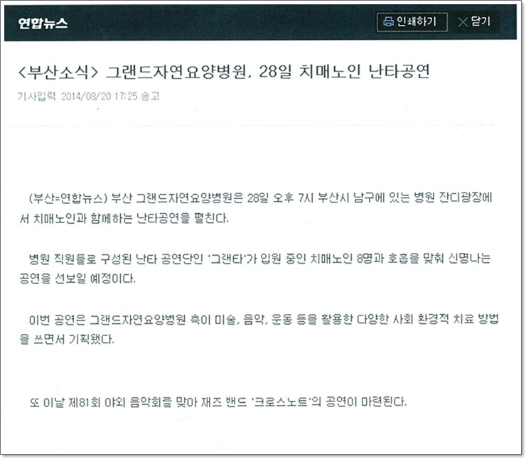 [연합뉴스] 부산소식-그랜드자연요양병원, 난타공연. 페이지 정보 작성자 그랜드자연병원 작성일14-09-11 15:25 조회2,240회 댓글0건 이전글 다음글 목록 본문 [출처 : 연합뉴스 2014.08.20 / 민영규 기자] 댓글목록 등록된 댓글이 없습니다. 이전글 다음글 목록