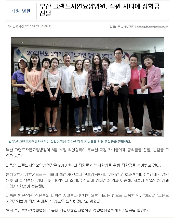 [의협신문] 부산 그랜드자연요양병원, 직원 자녀에 장학금 전달. 페이지 정보 작성자 그랜드자연병원 작성일13-09-09 15:54 조회2,460회 댓글0건 이전글 다음글 목록 본문 [출처 : 의협신문 2013.9.3./ 송성철 기자] 댓글목록 등록된 댓글이 없습니다. 이전글 다음글 목록