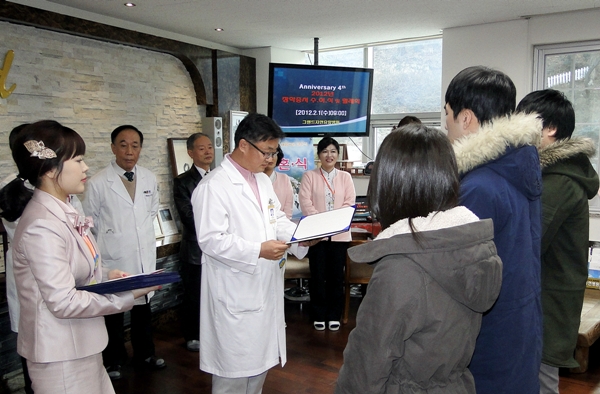[사진설명]▲ 나용승 그랜드자연요양병원장이 장학증서와 장학금을 전달하고 있다. [출처:의협신문.2012.2.13/송성철 기자] 그랜드자연요양병원이 직원들의 복지 향상을 위해 장학금 제도를 신설했다. 그랜드자연요양병원은 최근 제 1회 그랜드자연장학회 장학증서 수여식을 열고, 4명의 직원 자녀들에게 장학금을 전달했다. 나용승 병원장은 장학증서 수여식에서 "임직원들의 대학생 자녀들과 함께한 오늘 자리가 참으로 소중한 만남"이라면서 "미래의 주인공들에게 큰 박수를 부탁한다"고 격려를 아끼지 않았다. 나 병원장은 "그랜드자연장학회가 점차 확대될 수 있도록 함께 노력해 나가자"고 당부했다. 그랜드자연장학회 첫 장학생으로는 전보경 간호조무사의 자녀 최선아(김해대학) 양을 비롯해 신순애 요양보호사(윤장석·동서대학)·최미애 조리사(임채준·동의대)·이명자 조리원(박소영·서울대)의 자녀가 선정됐다.
