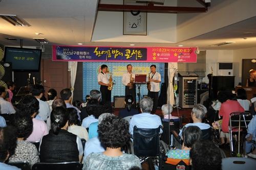 부산/아시아투데이 김옥빈 기자 = 부산 남구문화원(원장 성재영)은 최근 대연동 그랜드자연요양병원(병원장 나용승)에서 아카펠라,한국무용,오카리나, 색소폰 공연 등 찾아가는 문화행사 ‘한여름밤의 콘서트’ 행사를 가졌다. <출처:아시아투데이 김옥빈 기자 obkim5153@naver.com>