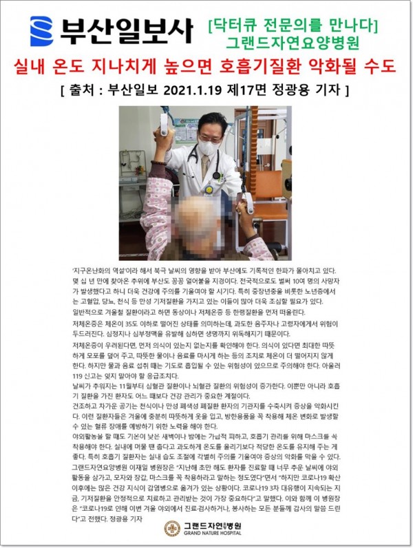 [부산일보] 닥터큐 전문의를 만나다 - 그랜드자연요양병원 이재일 병원장 '실내 온도 지나치게 높으면 호흡기질환 악화될… 페이지 정보 작성자 최고관리자 작성일21-01-20 11:30 조회2,408회 댓글0건 이전글 다음글 목록 본문 [ 출처 : 부산일보 2021. 1.19 제17면 정광용기자 ] 댓글목록 등록된 댓글이 없습니다. 이전글 다음글 목록