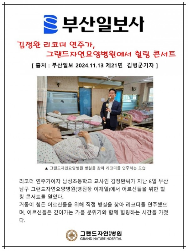 [부산일보]김정완 리코더 연주가, 그랜드자연요양병원에서 힐링 콘서트 페이지 정보 작성자 최고관리자 작성일24-11-13 11:08 조회1,687회 댓글0건 이전글 다음글 목록 본문 [ 출처 : 부산일보 2024. 11.13 제21면 김병군 기자 ] 댓글목록 등록된 댓글이 없습니다. 이전글 다음글 목록