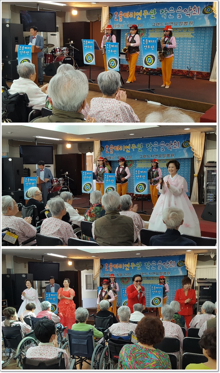 6월 13일 한울타리 연주단의 공연으로 그랜드자연요양병원 5층 이벤트홀에서 작은음악회가 열렸다. 한울타리 연주단은 색소폰 합주, 옛가요 등으로 어르신들과 함께 흥겨운 시간을 마련했다.