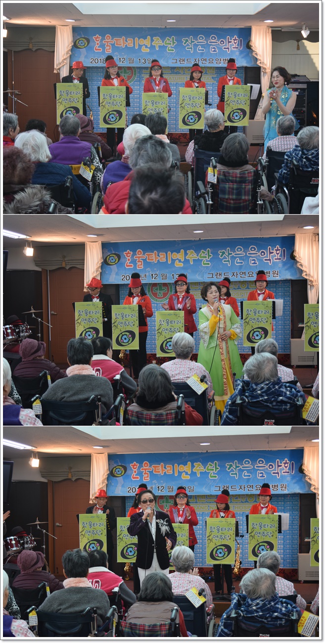지난 12월 13일 한울타리 연주단의 공연으로 그랜드자연요양병원 5층 이벤트홀에서 작은음악회가 열렸다. 한울타리 연주단은 색소폰 합주, 옛가요 등으로 어르신들과 함께 흥겨운 시간을 보냈다.