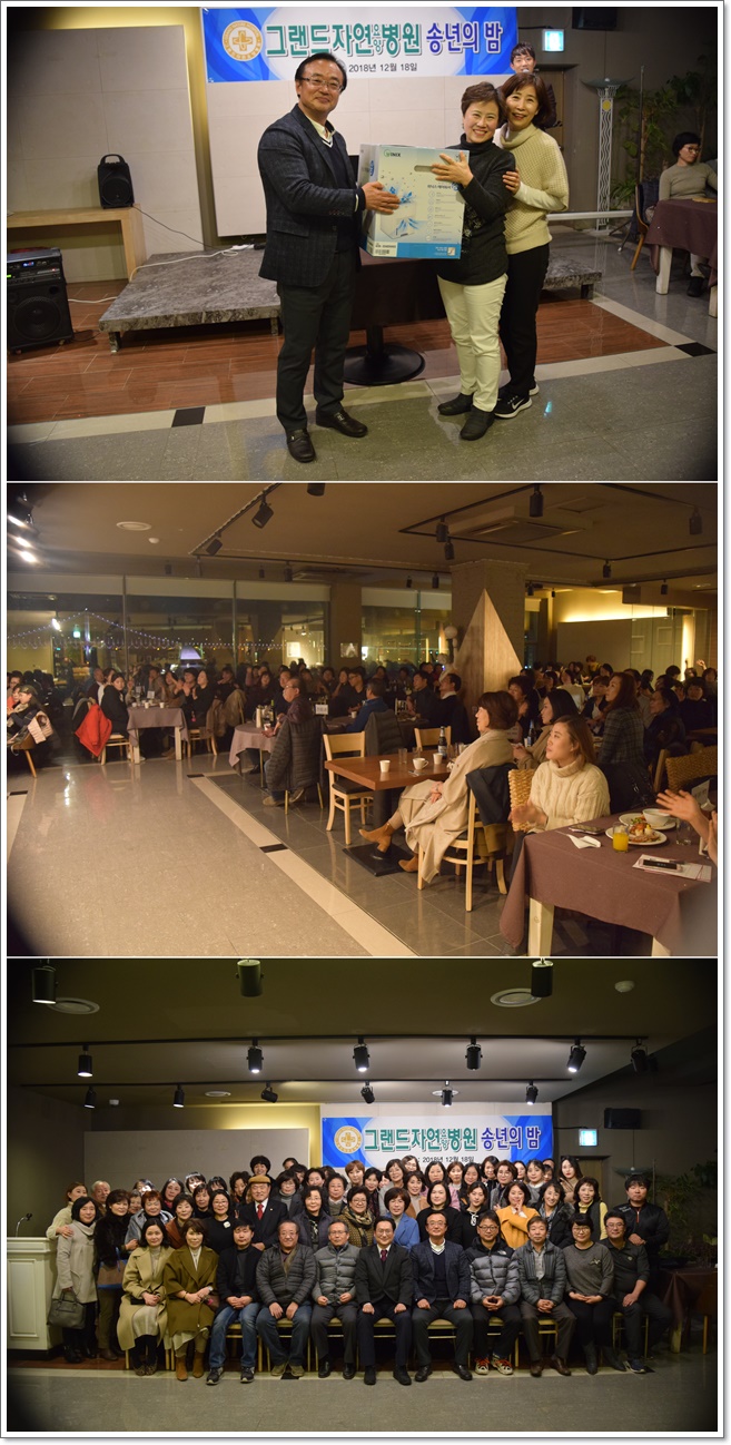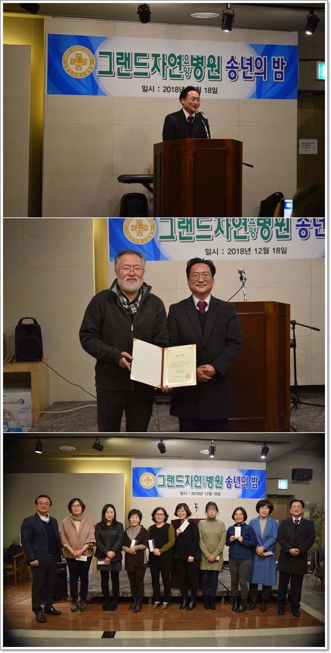 지난 12월 18일 그랜드자연요양병원은 2018년 그랜드 송년의 밤 행사를 가졌다. 장기 근속자에 대한 시상과 노인용 교구 활용 프로그램, 미술요법, 웃음요법, 음악요법 등 자원봉사자들에 대한 감사장이 수여되었으며 덕담과 감사의 마음을 나누며 한해를 마무리 하는 시간을 가졌다. 또한 나용승 명예원장과 이재일 병원장은 우리 직원들의 수고에 감사하며 2018년 한해를 마무리하고 또 다른 새해를 준비하는 마음으로 송년의 밤을 마쳤다.