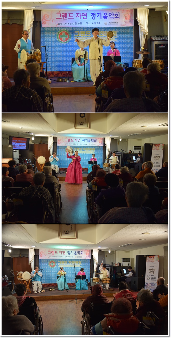 12월 27일 그랜드자연요양병원은 "우리소리 우리가락청"의 공연으로 <제132회 그랜드자연 송년음악회>를 열었다. 이날 공연은 한 해의 안좋은 일들을 떨쳐버리고 새해의 안녕과 복을 비는 "수영 지신밟기"등으로 어르신들과 함께 새해를 맞이하는 좋은 시간을 가졌다. 또한 판소리, 사랑가를 비롯하여 팔도민요 등 평소 익숙한 곡들로 추임새와 함께 흥을 돋우며 즐거운 시간을 마련하였다.