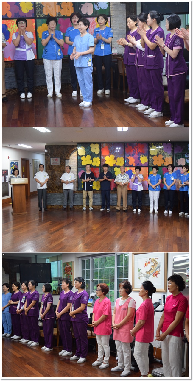 그랜드자연요양병원은 지난 9월 3일 1층 로비에서 전직원들이 참석한 가운데 그랜드자연 월례회를 가졌다. 이재일 병원장은 환절기 어르신들의 건강 관리에 만전을 기하자고 강조하였으며. 이어서 신입직원들의 인사가 이어졌다.