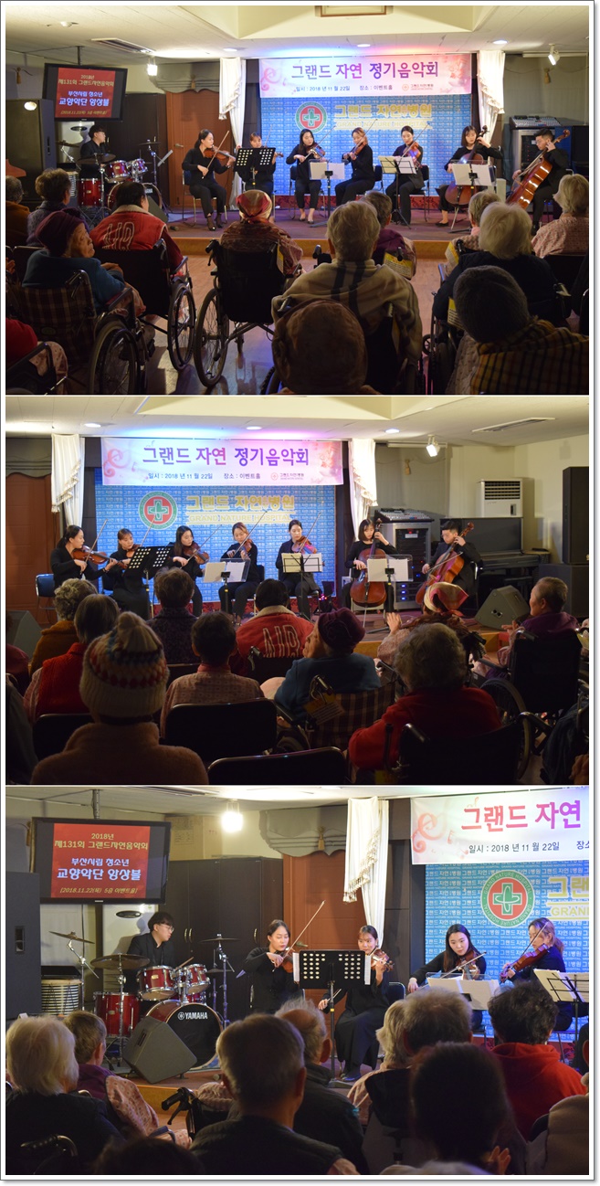 그랜드자연요양병원은 "부산시립 청소년 교향악단 앙상블"의 공연으로 제131회 그랜드자연음악회를 열었다. "부산시립 청소년 교향악단 앙상블"은 어르신들이 좋아하시는 민요와 옛가요를 바이올린, 비올라, 첼로 등의 무대로 꾸며서 즐거운 시간을 마련하였다.
