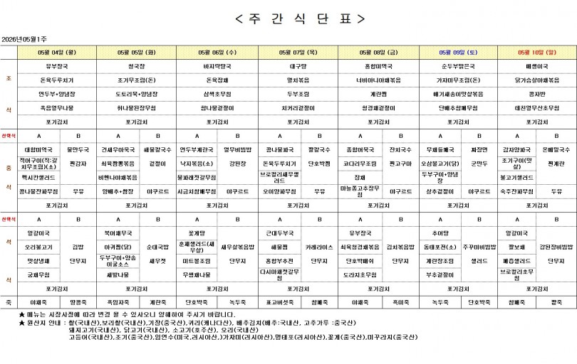주간 식단표 (5월 1주) 페이지 정보 작성자 최고관리자 작성일26-04-30 10:57 조회9회 댓글0건 다음글 목록 본문 주간 식단표 (5월 1주) 댓글목록 등록된 댓글이 없습니다. 다음글 목록