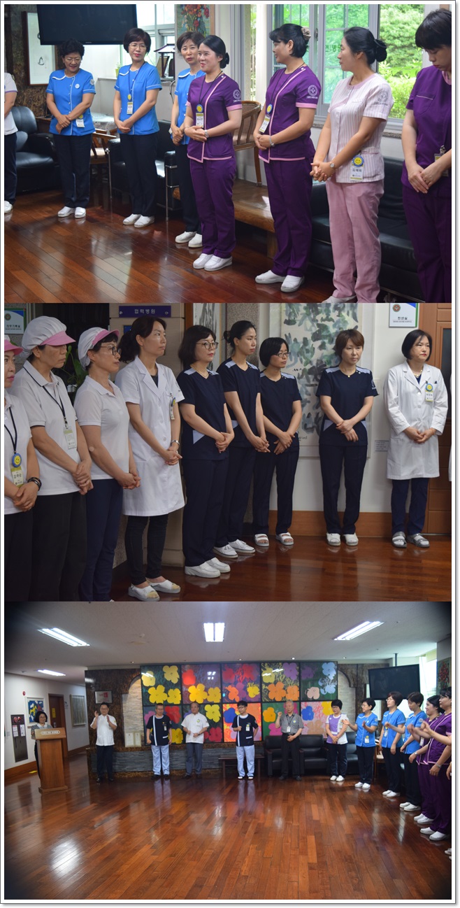 그랜드자연요양병원은 7월 2일 1층 로비에서 전직원들이 참석한 가운데 그랜드자연 월례회를 가졌다. 이재일 병원장은 날씨가 더워짐에 있어 어르신들의 음식물 관리와 건강관리에 더 각별한 주의를 당부하였으며. 이어서 신입직원들의 인사가 이어졌고 홍순애 원무과장의 7월의 다짐을 발표하며 월례회를 마쳤다.