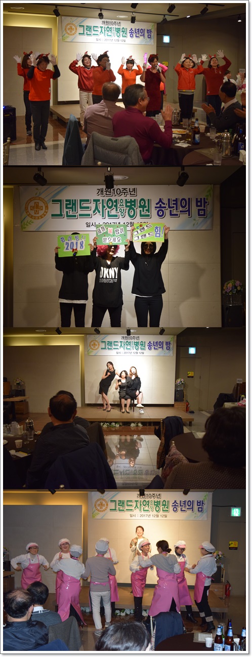 지난 12월 12일 그랜드자연요양병원은 2017년 그랜드 송년의 밤 행사를 가졌다. 장기 근속자에 대한 시상과 노인용 교구 활용 프로그램, 미술치료, 웃음치료, 음악치료 등 자원봉사자들에 대한 감사장이 수여되었으며 덕담과 감사의 마음을 나누며 한해를 마무리 하는 시간을 가졌다. 또한 나용승 명예원장과 이재일 병원장은 우리 직원들의 수고에 감사하며 장기 근속자들을 큰 재산으로 생각하고 있다고 송년사를 대신하였다. 2부에서는 개원10주년을 맞아 부서별로 직원들의 끼를 맘껏 표현할 수 있는 무대로 꾸며졌다. 김용철 부원장의 건배사와 함께 2017년 한해를 마무리하고 또 다른 새해를 준비하는 마음으로 송년의 밤을 마쳤다.