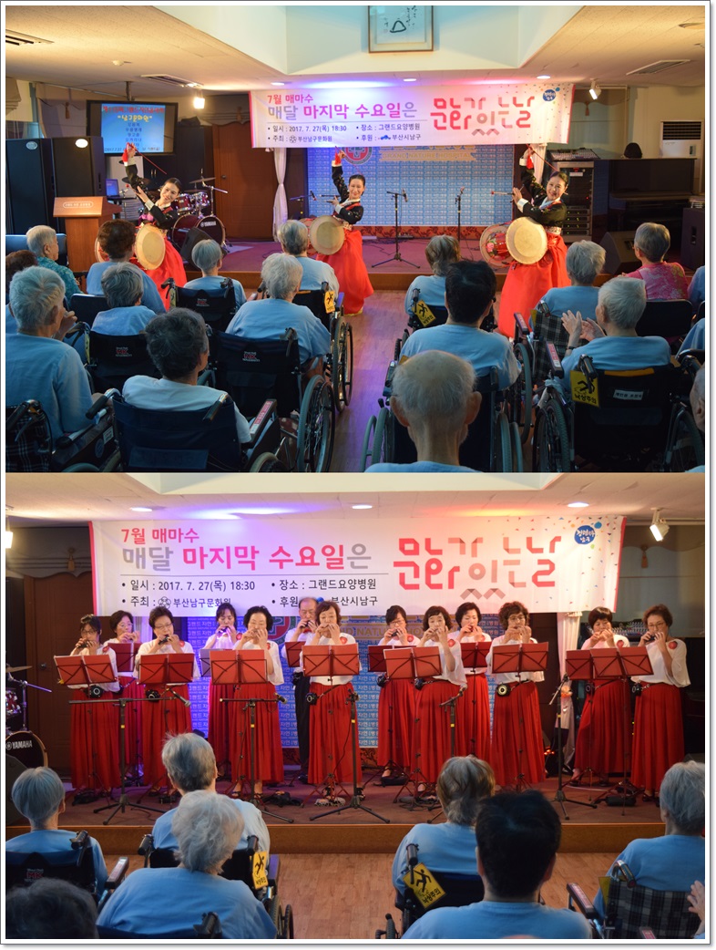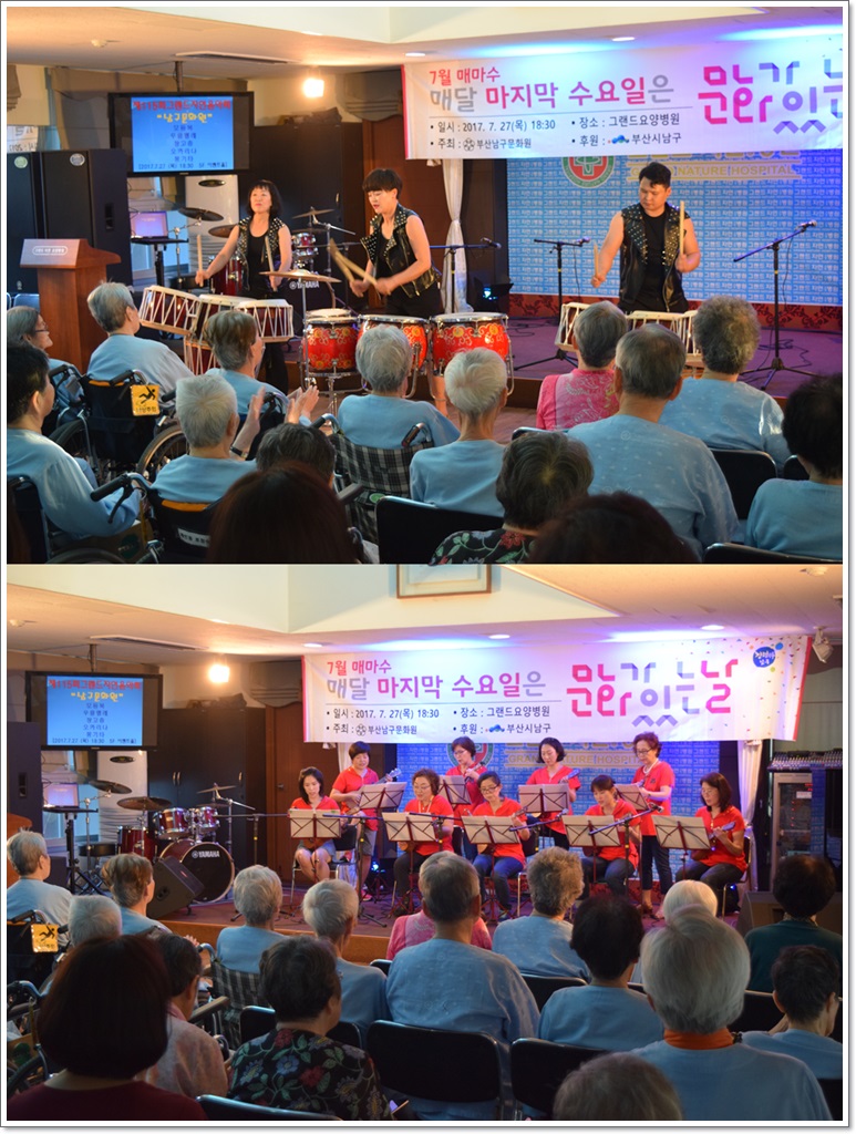 제115회 그랜드자연음악회 - 남구문화원 페이지 정보 작성자 최고관리자 작성일17-08-16 14:49 조회1,742회 댓글0건 이전글 다음글 목록 본문 지난 7월 27일 그랜드자연요양병원은 <남구문화원>의 공연으로 제115회 그랜드자연음악회를 열었다. 이날 공연은 무형문화재 제6호 이수자들로 구성된 "더 굿"팀의 모듬북으로 무대를 열어 우쿨렐레, 장고춤, 오카리나 등의 연주와 즐거운 통기타 연주를 마지막으로 무대를 꾸몄다. 댓글목록 등록된 댓글이 없습니다. 이전글 다음글 목록