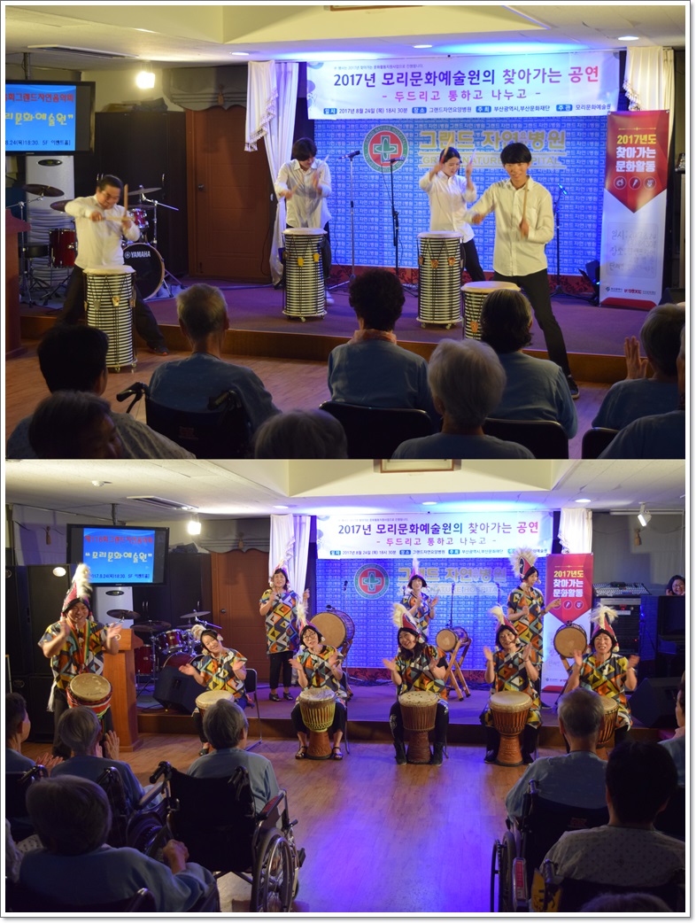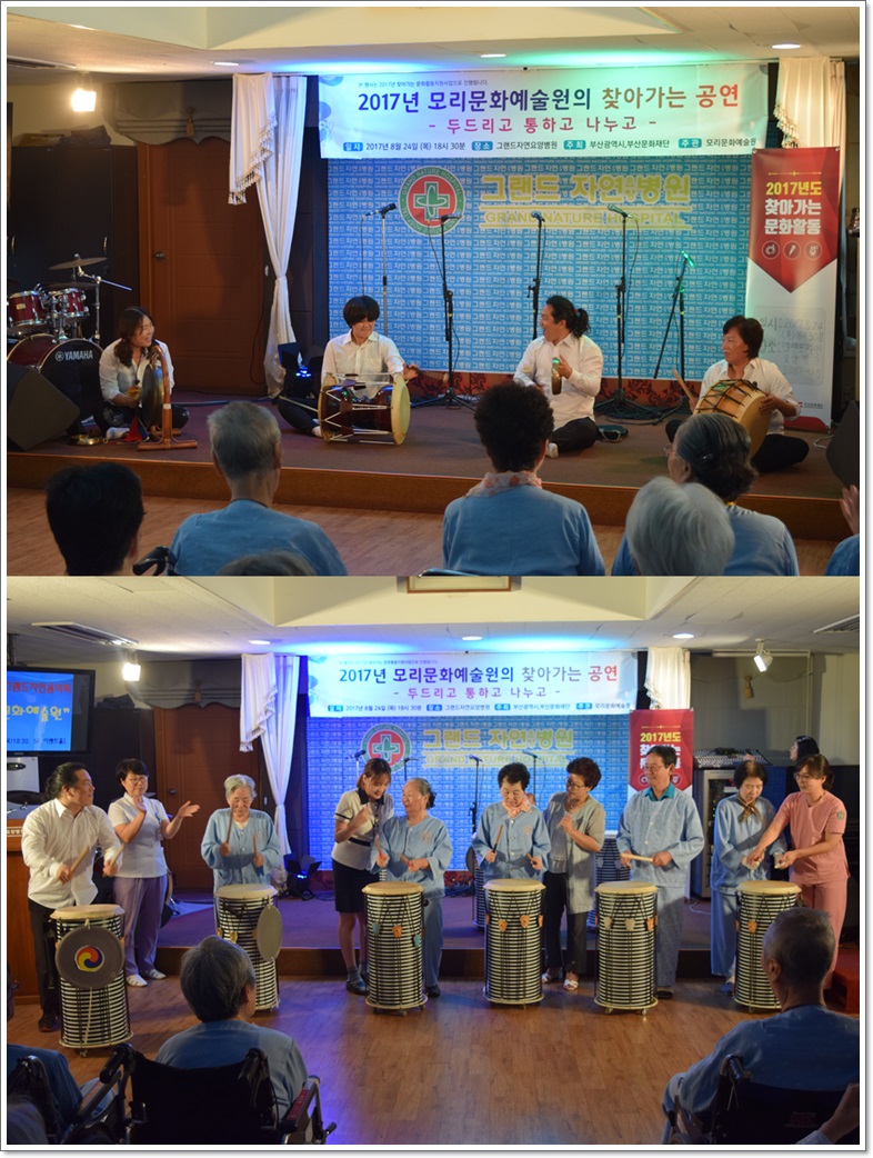 지난 8월 24일 그랜드자연요양병원은 <모리문화예술원>의 공연으로 제116회 그랜드자연음악회를 열었다. <모리문화예술원>은 우리가 흔히 알고 있던 민요뿐 아니라 사물놀이, 난타 등을 함께 선보이며 우리소리의 아름다움을 표현하였다. 또한 아프리카 타악 젬베로 흥겨움을 함께 나누었다.