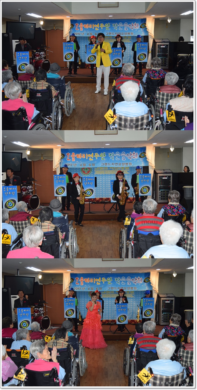 4월의 작은 음악회 - 한울타리 연주단 공연 페이지 정보 작성자 최고관리자 작성일17-05-12 16:33 조회1,711회 댓글0건 이전글 다음글 목록 본문 지난 4월 6일 한울타리 연주단의 공연으로 작은 음악회가 그랜드자연요양병원 5층 이벤트홀에서 열렸다.한울타리 연주단의 이날 공연은 흥겨운 옛가요를 비롯하여, 색소폰의 합주로 어르신들과 함께 할 수 있는 흥겨운 시간을 마련했다. 댓글목록 등록된 댓글이 없습니다. 이전글 다음글 목록