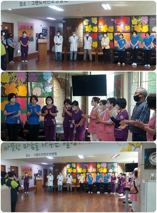 그랜드자연요양병원은 5월 7일 1층 로비에서 전직원들이 참석한 가운데 그랜드자연 월례회를 가졌다. 이날 이재일 병원장은 가정의 달인 만큼 어르신들께 사랑의 마음과 표현을 듬뿍 하기를 강조 하였으며, 이어서 신입 직원들의 인사가 이어졌고, 푸르름이 가득한 5월을 준비하는 마음으로 "그랜드 그랜드 힘!"의 구호와 함께 5월 월례회를 마쳤다.