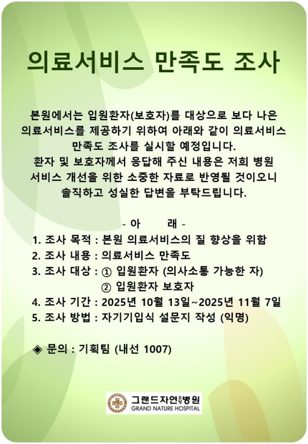 의료서비스 만족도 조사(2025년10월13일~11월7일) 페이지 정보 작성자 최고관리자 작성일25-10-10 12:24 조회717회 댓글0건 이전글 다음글 목록 본문 의료서비스 만족도 조사 댓글목록 등록된 댓글이 없습니다. 이전글 다음글 목록