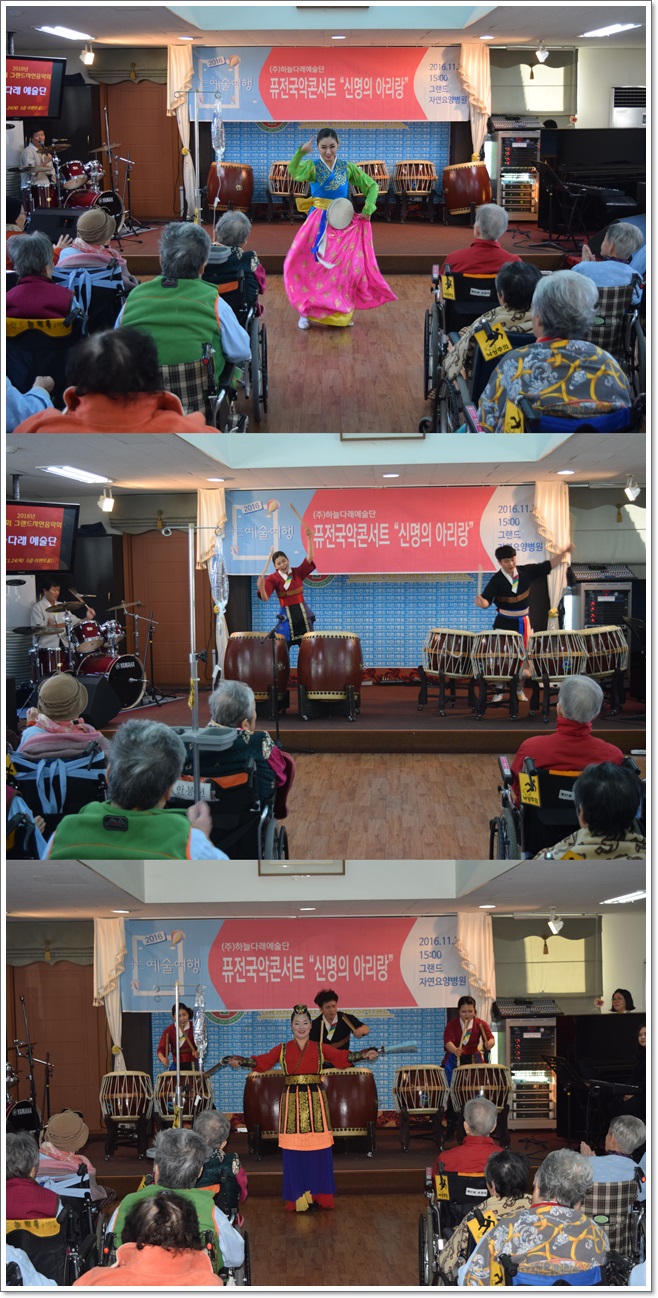 퓨전국악 <하늘다래 예술단>의 공연은 국악과 양악이 신명난 리듬으로 앙상블을 이루어 어르신들께 쉽게 다가갔다.