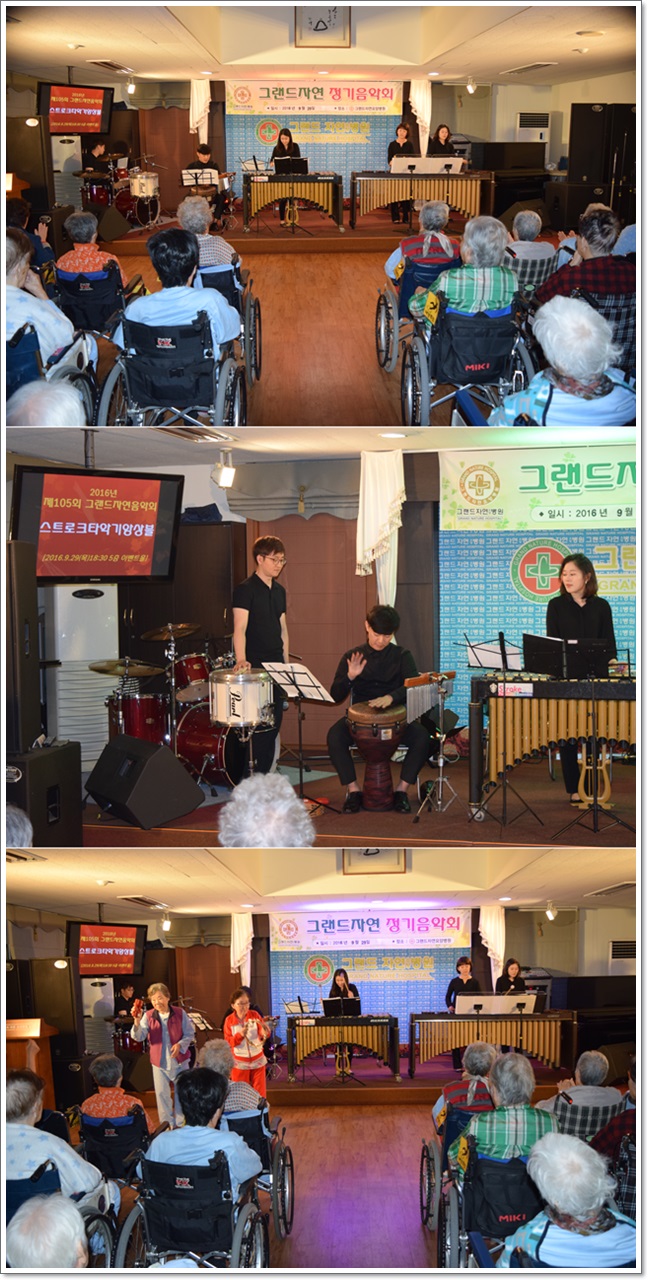 지난 9월29일 그랜드자연요양병원은 <스트로크타악기 앙상블>의 공연으로 제105회 그랜드자연음악회를 열었다.