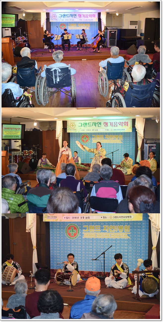 지난 3월 31일 그랜드자연요양병원은 부산시립교향악단 현악4중주단과 부산시립국악관현악단의 초청공연으로 제99회 그랜드자연음악회를 열었다. 엘가의 <사랑의 인사>를 시작으로 한곡 한곡의 배경설명을 들으며 어르신들이 좋아하는 도라지, 아리랑의 연주로 즐거운 시간을 보냈으며 흥겨운 민요 한마당과 사물놀이로 함께하며 신나는 시간을 마쳤다.