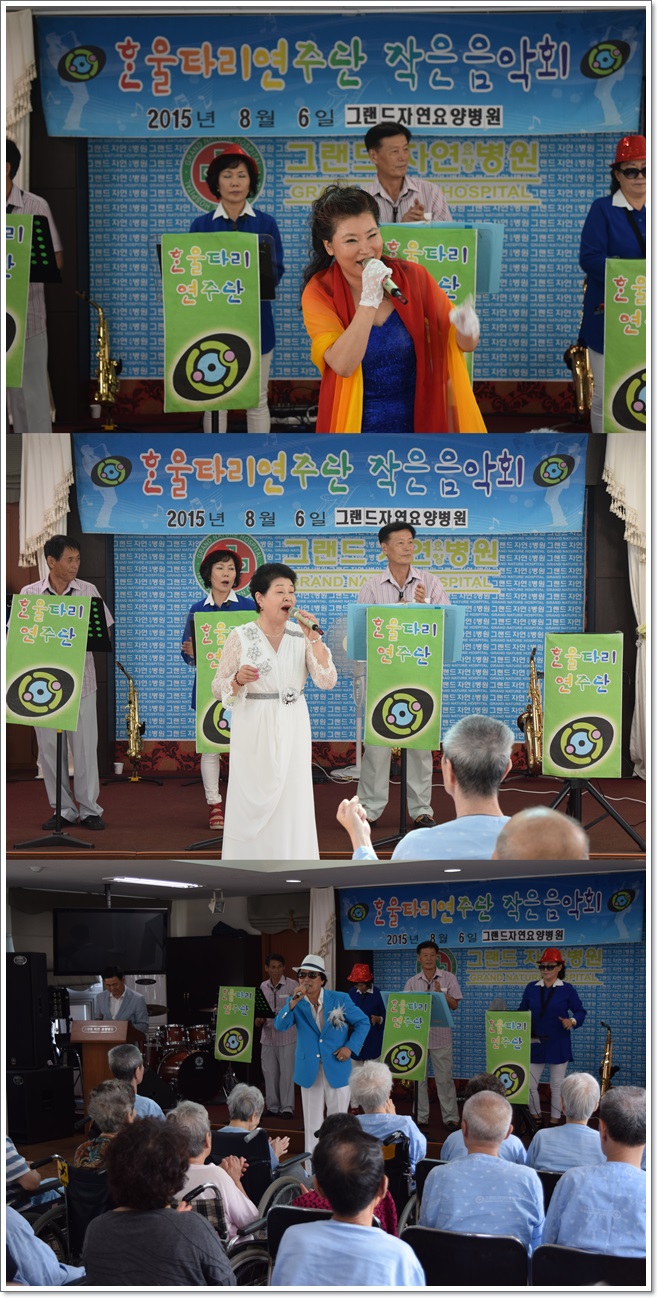 지난 8월 6일 그랜드자연요양병원을 찾은 한울타리 연주단은 가수 최명운의 추억의 소야곡, 서귀포 칠십리를 시작으로 가수 신성자의 꽃타령, 새타령을 비롯하여 색소폰의 합주로 어르신들과 함께 할 수 있는 흥겨운 시간을 마련했다. 마지막 무대를 장식한 서용의 메들리는 어르신들의 어깨를 들썩이게 한 신나는 시간이었다.