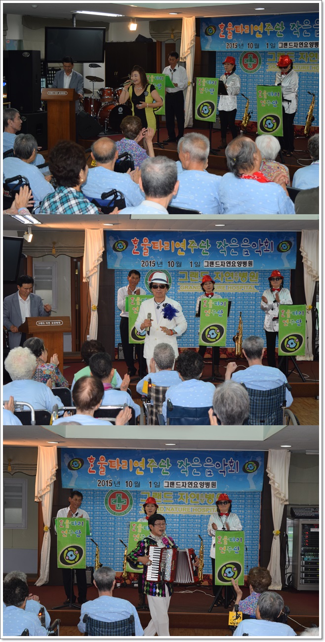 10월의 작은음악회 - 한울타리 연주단 공연 페이지 정보 작성자 최고관리자 작성일15-10-15 11:55 조회2,070회 댓글0건 이전글 다음글 목록 본문 지난 10월 1일 한울타리 연주단의 공연으로 작은음악회가 그랜드자연요양병원 5층 이벤트홀에서 열렸다.한울타리 연주단의 이날 공연은 가수 정희정, 서용, 임대윤 등의 흥겨운 옛가요를 비롯하여, 색소폰의 합주로 어르신들과 함께 할 수 있는 흥겨운 시간을 마렸했다. 댓글목록 등록된 댓글이 없습니다. 이전글 다음글 목록