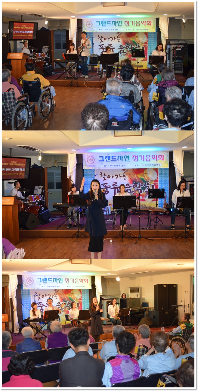지난 10월 22일 그랜드자연요양병원은 퓨전 국악 그룹, 소리 팔레트와 함께 제94회 그랜드자연음악회를 열었다. 소리 팔레트는 대금, 해금, 가야금 등의 국악기와 베이스, 드럼, 건반 등의 양악기로 이루어진 퓨전 국악 그룹이다. 이날 공연은 여러가지 색을 팔레트에 골라 그림을 그리듯 여러가지 악기로 우리 귀에 친숙한 국악, 팝송, 가요, 영화음악 등을 편곡해서 들려 주었다. 과일과 곡식이 익어가는 풍요로운 계절, 어르신들은 풍성한 풍류 음악회로 행복한 가을의 저녁 시간을 보냈다.