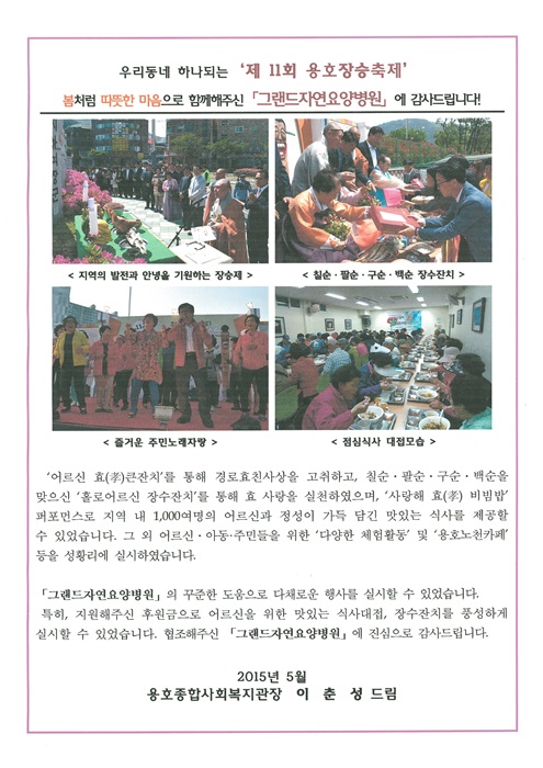 그랜드자연요양병원(병원장 이재일)은 지난 5월 8일~9일 용호종합사회복지관에서 열린 '어르신 효 큰잔치'를 통해 효사랑을 실천하였다.