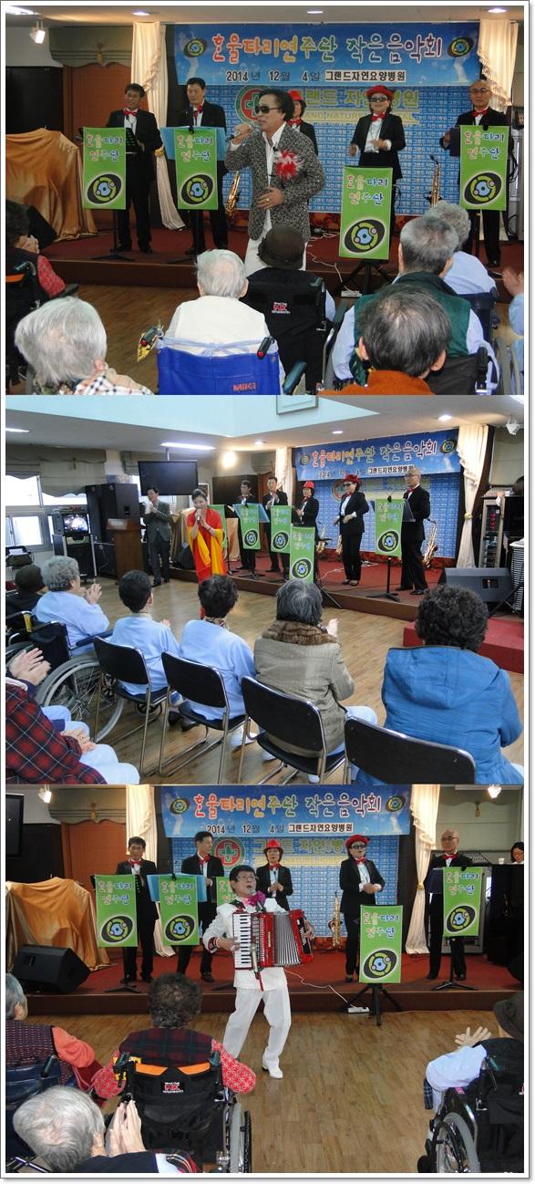 12월의 작은 음악회 - 한울타리 연주단 공연 페이지 정보 작성자 최고관리자 작성일15-01-09 14:18 조회2,719회 댓글0건 이전글 다음글 목록 본문 지난 12월 4일 한울타리 연주단의 공연이 그랜드자연요양병원 5층 이벤트홀에서 열렸다.매월 한차례 문화 봉사 활동을 펼치고 있는 한울타리 연주단의 이날 공연은 가수 서용, 오레, 임대윤 등의 흥겨운 옛가요를 비롯하여, 색소폰의 합주로 어르신들과 함께 할 수 있는 흥겨운 시간을 마렸했다. 댓글목록 등록된 댓글이 없습니다. 이전글 다음글 목록
