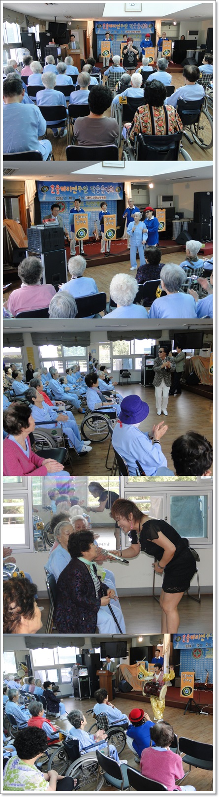 지난 10월 2일 한울타리 연주단의 공연이 그랜드자연요양병원 5층 이벤트홀에서 열렸다. 매월 한차례 문화 봉사 활동을 펼치고 있는 한울타리 연주단의 이날 공연은 가수 서용의 흥겨운 옛가요를 시작으로 가수 오래, 가수 임대윤의 메들리를 비롯하여 특히, 어르신들의 노래부르기 대회로 함께 할 수 있는 흥겨운 시간을 마렸했다.