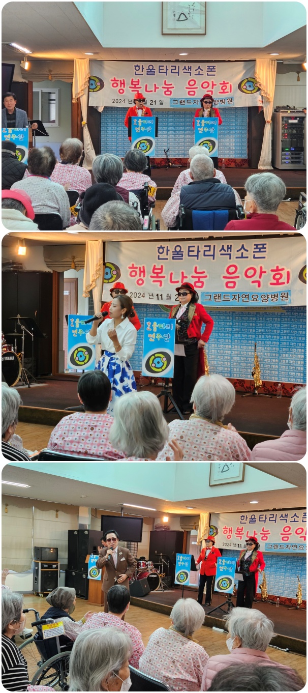 그랜드자연요양병원은 11월 21일 한울타리 색소폰의 <행복 나눔>공연으로 작은 음악회를 열었다. 이날 공연은 <물새 우는 강 언덕>, <부산 갈매기> 등의 색소폰 연주와 <아리랑>, <태평가> 등의 옛가요, 민요로 어르신들과 함께 즐거운 시간을 마련했다.