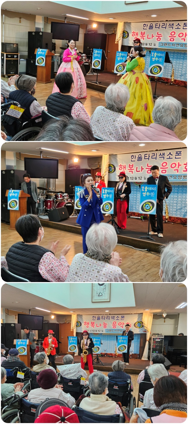 그랜드자연요양병원은 12월 12일 한울타리 색소폰의 <행복 나눔>공연으로 작은 음악회를 열었다. 이날 공연은 <해운대 엘레지>, <찔레꽃> 등의 색소폰 연주와 <동백 아가씨>, <부초같은 인생> 등의 옛가요로 어르신들과 함께 즐거운 시간을 마련했다.