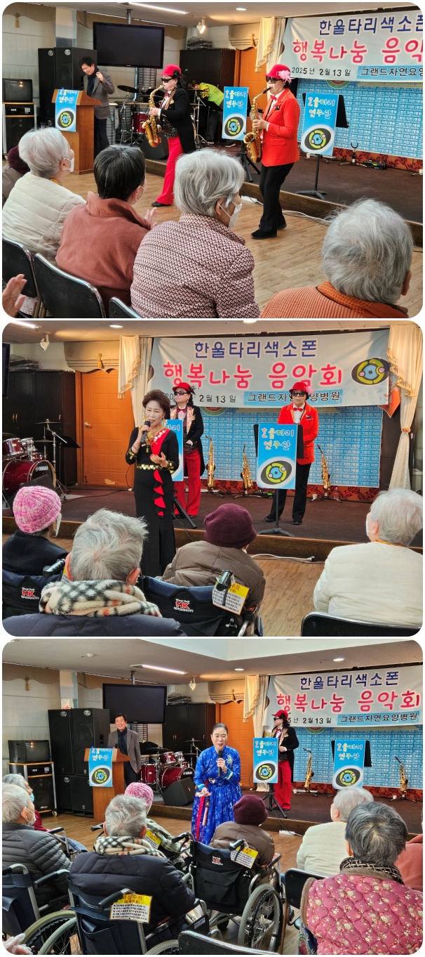 그랜드자연요양병원은 2월 13일 한울타리 색소폰의 <행복 나눔>공연으로 작은 음악회를 열었다. 이날 공연은 <물새 우는 강 언덕>, <달타령> 등의 색소폰 연주와 <노들강변>, <진도 아리랑> 등의 옛가요, 민요로 어르신들과 함께 즐거운 시간을 마련했다.