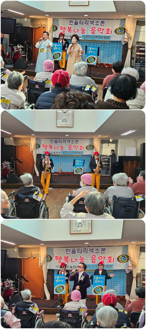 그랜드자연요양병원은 3월 20일 한울타리 색소폰의 <행복 나눔>공연으로 작은 음악회를 열었다. 이날 공연은 <해운대 엘레지>, <찔레꽃> 등의 색소폰 연주와 <동백 아가씨>, <부초같은 인생> 등의 옛가요로 어르신들과 함께 즐거운 시간을 마련했다.