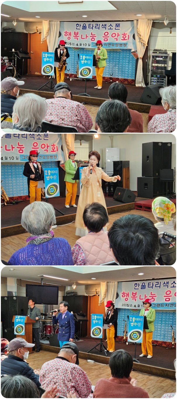 4월 10일 한울타리 연주단의 공연으로 그랜드자연요양병원 5층 이벤트홀에서 작은음악회가 열렸다. 한울타리 연주단은 <울어라 열풍아>, <창부타령>등 어르신들이 평소 즐겨 부르시는 옛가요와 민요를 비롯하여 색소폰 연주로 어르신들과 함께 흥겨운 시간을 마련했다.