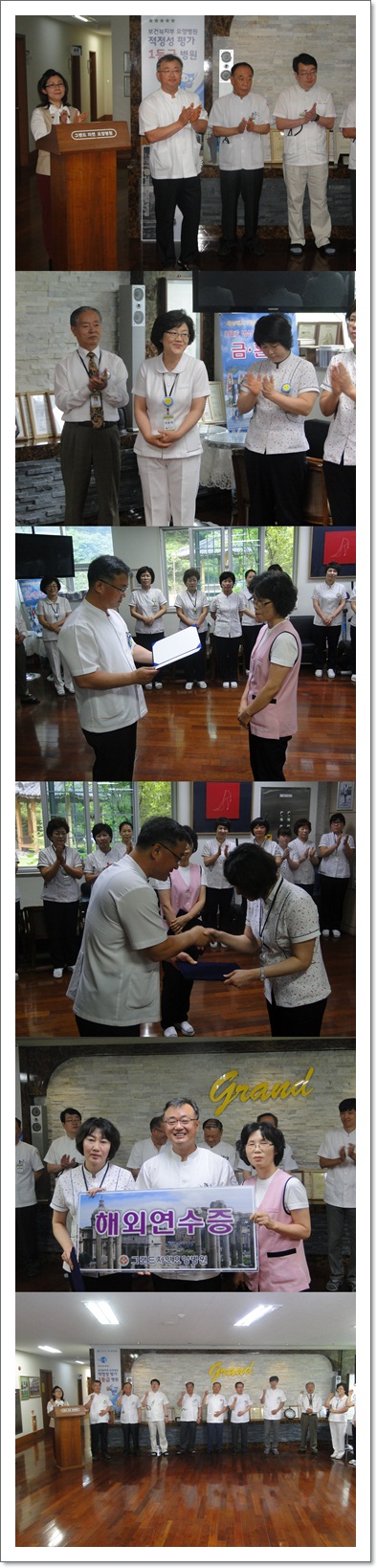 그랜드자연요양병원은 지난 6월 2일 1층 로비에서 전직원들이 참석한 가운데 그랜드자연 월례회를 가졌다. 나용승 병원장은 날씨가 더워짐에 있어 어르신들의 건강 관리에 만전을 기하자고 강조하였으며. 이어서 신입직원들의 인사가 이어졌고 6월에 생일을 맞이한 직원들을 축하하며 작은 정성으로 마련된 선물이 전달되었다. 또한, 2014년도 상반기 우수직원에 대한 시상이 이어졌다. 수상자는 간병과 이옥남 주임과 간호과 제정경 선생님이며, 11월에 해외여행을 계획하고 있다.