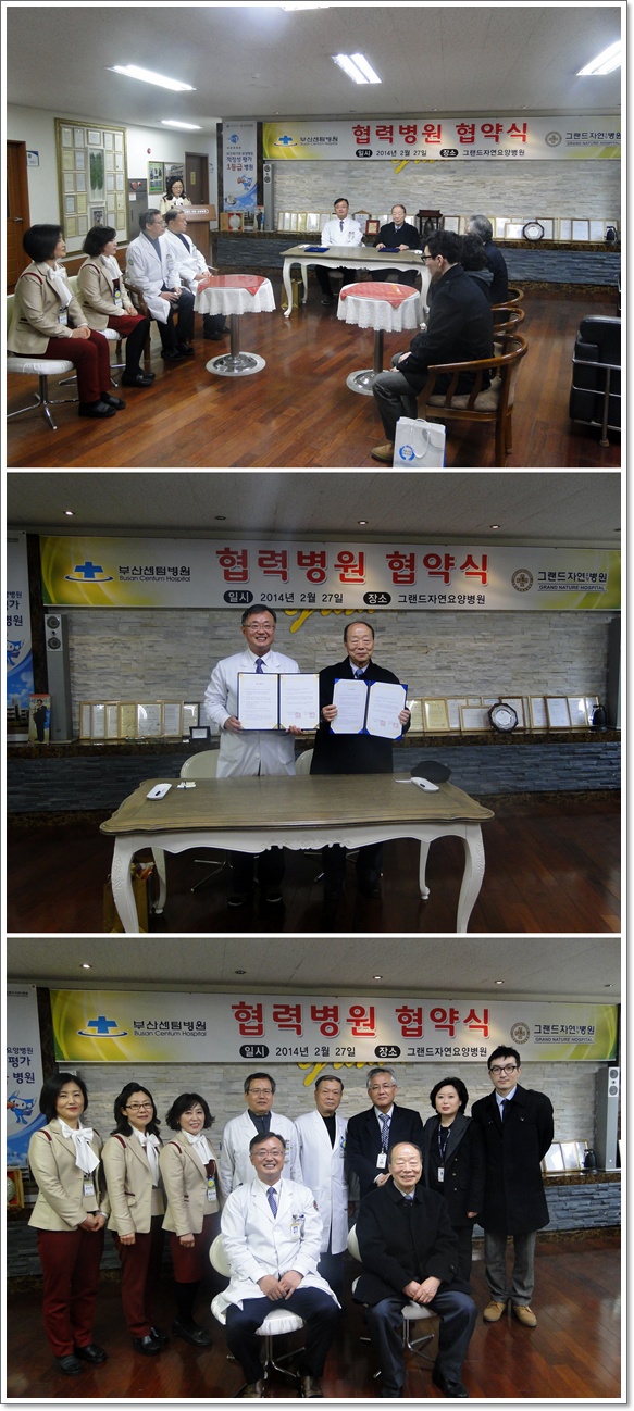 지난 2월 27일 그랜드자연요양병원(병원장 나용승)은 정형외과 전문 부산센텀병원과 협력병원 협약식을 가졌다. 이 협약은 그랜드자연요양병원과 부산센텀병원 간에 진료, 연구, 교육에 관한 협력체계를 구축하여 상호 지원함으로써 국민보건 및 의료계의 발전과 양 기관의 상호 발전을 도모하는데 있다고 나용승 병원장은 밝혔다. 이날 참석자로 그랜드자연요양병원측에서는 나용승 병원장, 정형외과 김광명 진료과장, 하필성 진료과장, 홍순애 원무과장, 유인주 행정과장, 이지영 기획홍보팀장이 부산센텀병원측에서는 이종명 외과부장, 류종길 행정부원장, 서미숙 간호부장, 총무과 이종호 주임이 각각 참석하였다.
