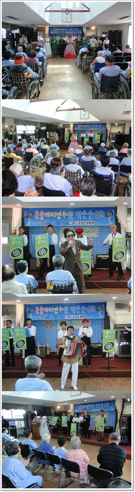 지난 5월 8일 그랜드자연요양병원을 찾은 한울타리 연주단은 <어머님 은혜>를 합창으로 첫무대를 열었다. 가수 오레의 <하늘땅 만큼>을 시작으로 가수 서용의 <안동역에서>, 가수 임대윤의 <옛가요 메들리> 등 흥겨운 옛가요를 비롯하여 색소폰의 합주로 어르신들과 함께 할 수 있는 흥겨운 시간을 마렸했다. 어버이 날을 맞아 가족들과 함께한 어르신들은 입가에 미소가 가득한 하루가 되었다..
