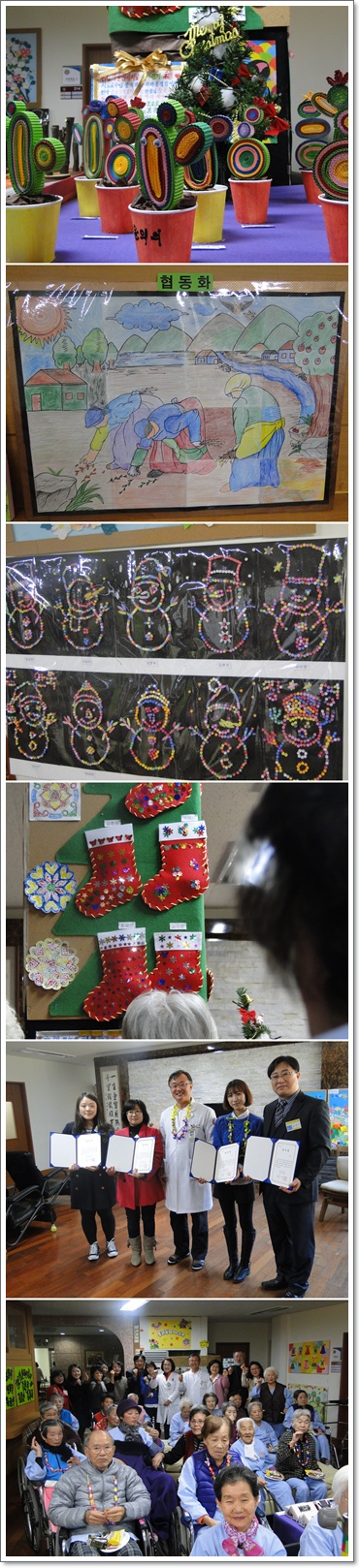 그랜드자연요양병원은 지난 12월 27일 2층 문화홀에서 <미술심리치료 작품 전시회 - 그림으로 마음읽기> 작품전을 열었다. 나용승 병원장은 2010년 9월 14일 첫수업을 시작으로 한 주도 빠짐없이 어르신들을 위해 미술치료 수업을 해주신 윤석환 교수님께 감사의 말씀을 전하며 맨투맨 수업을 해주신 심경선, 김진희, 박영혜, 손은경 선생님께 감사장을 수여 하였다. 미술의 기법을 이용한 작품들이지만 그 과정속에는 눈과 손의 힘을 기르는 활동과 공간 지각 능력을 갖게 하는 활동들이 포함되어 있다. 작품을 감상한 후 어르신들과 다과의 시간을 가지며 지난 수업의 이야기꽃을 피웠다.