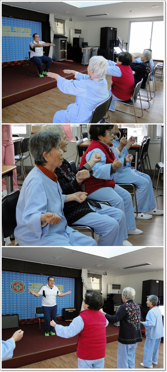그랜드자연요양병원에서는 어르신들께서 즐겨 들으시는 음악에 맞춰 신나게 추는 라인 댄스를 하고 있다. 짝이 별도로 없이 줄을 맞춰 추는 라인 댄스는 형식이 간단하여 우리 어르신들이 모두 즐길수 있는 춤이다.