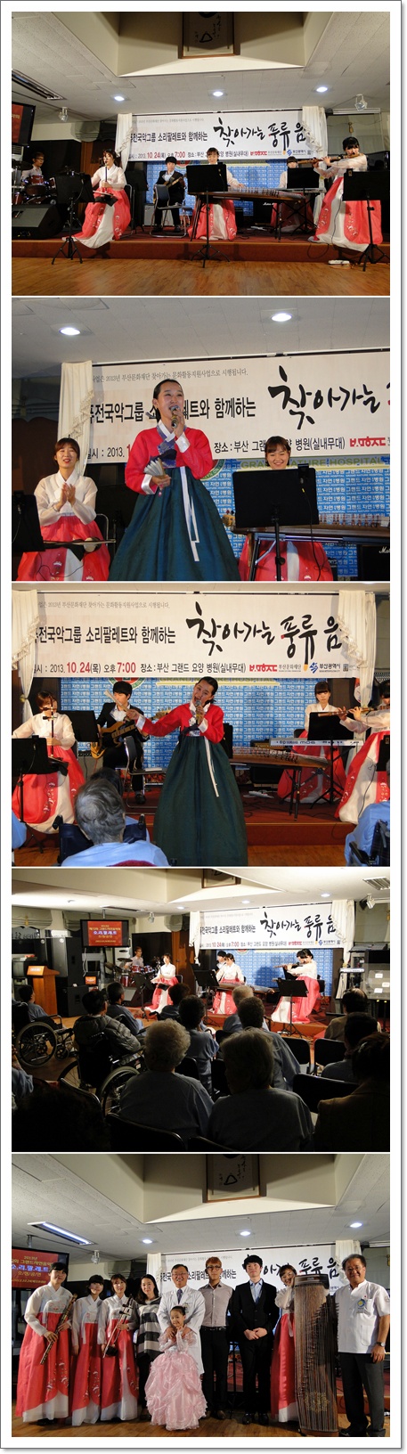 지난 10월 24일 그랜드자연요양병원은 퓨전 국악 그룹, 소리 팔레트와 함께 제72회 그랜드자연음악회를 열었다. 소리 팔레트는 대금, 해금, 가야금 등의 국악기와 베이스, 드럼, 건반 등의 양악기로 이루어진 퓨전 국악 그룹이다. 이날 공연은 여러가지 색을 팔레트에 골라 그림을 그리듯 여러가지 악기로 우리 귀에 친숙한 국악, 팝송, 가요, 영화음악 등을 편곡해서 들려 주었다. 과일과 곡식이 익어가는 풍요로운 계절, 어르신들은 풍성한 풍류 음악회로 행복한 가을의 저녁 시간을 보냈다.